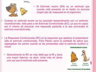 Se concluyó que las tres corrientes teóricas tratadas en este trabajo comparten una práctica. Estímulo neutro para convertirse en un estímulo condicionado ya que por medio de su relación o asociación con el grito provocaba una respuesta que no activaba inicialmente. Este término se usa principalmente cuando un estímulo está diseñado para causar una respuesta reflexiva. Siempre que el novio de Carly la llama su teléfono reproduce una canción específica como tono de llamada. Pero que después de asociarse con el estímulo incondicionado es capaz de elicitar respuestas intensas relacionadas con ese estímulo incondicionado. Ej ante un estímulo que espontáneamente no se la provoca el sonido de una campana p.